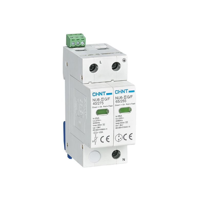Presenta una intensidad nominal de descarga (onda 8/20 µs) de 20 kA en L-N y 30 kA en N-PE, así como una intensidad máxima de descarga (onda 8/20 µs) de 40 kA en L-N y 65 kA en N-PE, garantizando una elevada capacidad de protección frente a picos de sobretensión.
